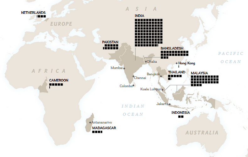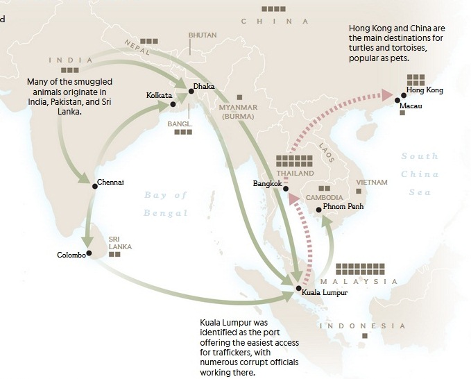 Több tucat nyomozó, elemző és titkos ügynök több úgy találta, hogy a teknősök a legtöbb esetben Indiából, Pakisztánból és Madagaszkárról csempészték ki és úti céljuk Kína és Hong Kong volt. A megvételre kínált fajok között a legnagyobb számban azok voltak, amelyek veszélyeztetett státuszba tartoznak a csökkenő számuk miatt, mint például az indiai csillagteknős és a fekete taviteknős.